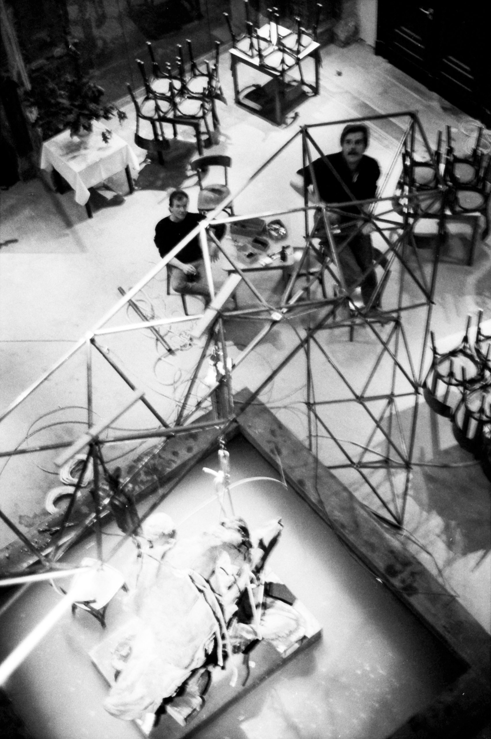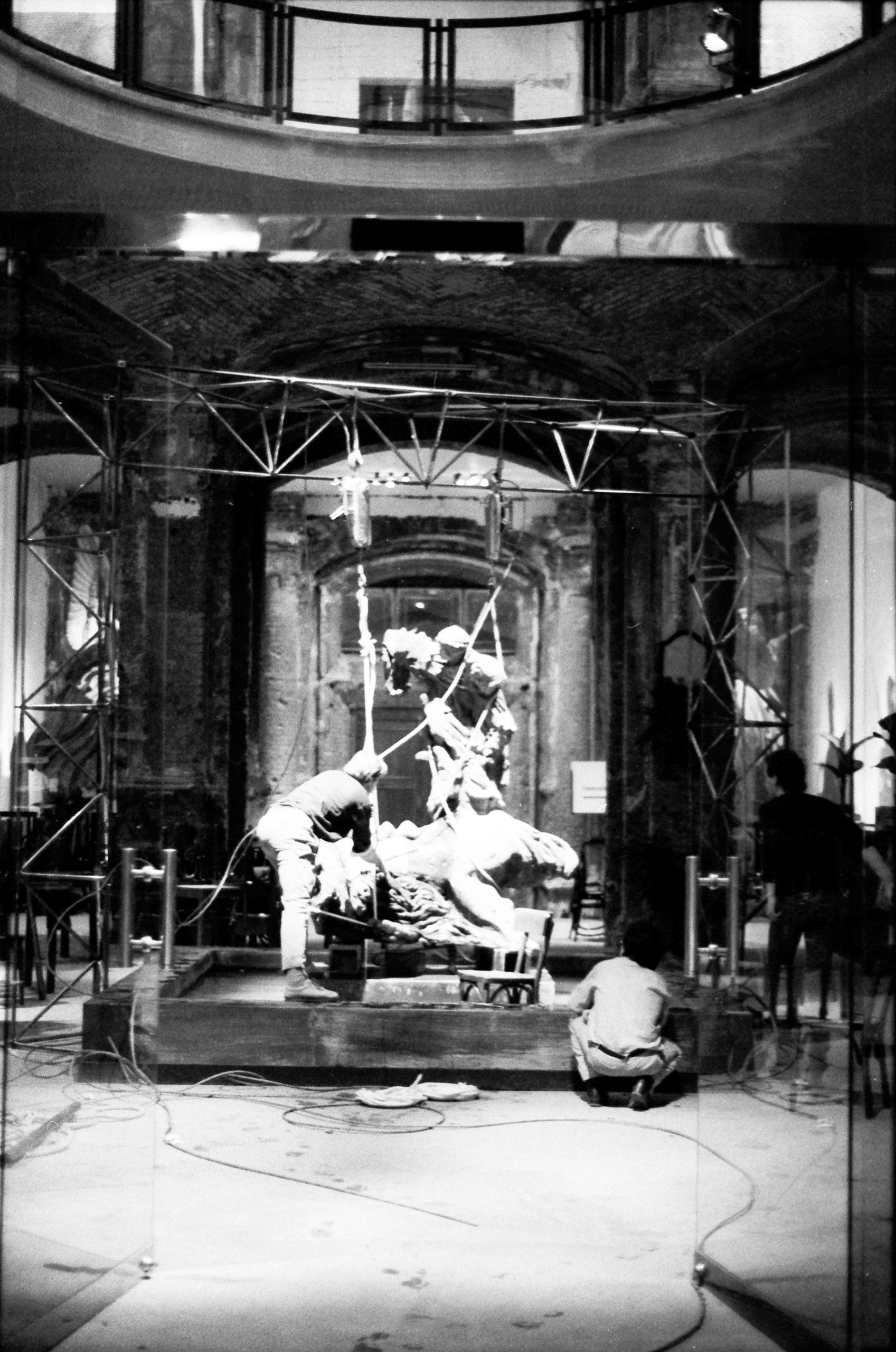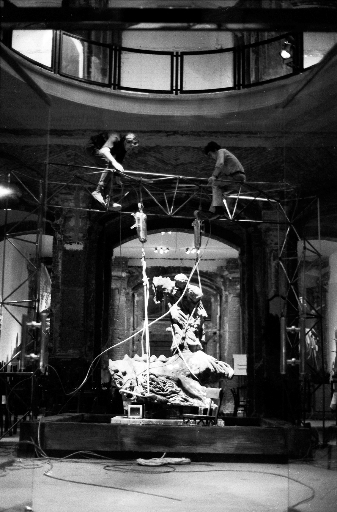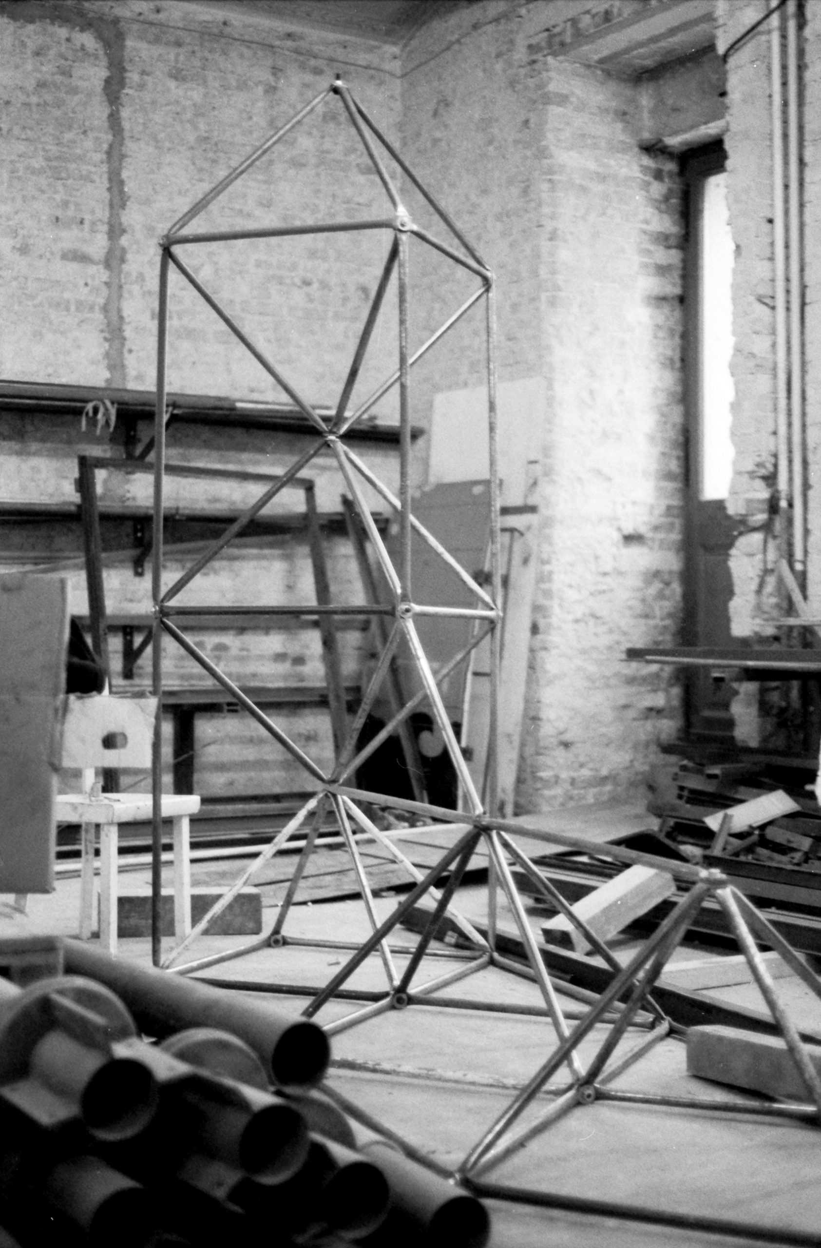 Die Zeitgeist-Ausstellung präsentierte in der Nordrotunde des Martin-Gropius-Baus eine Brunnenskulptur von Sandro Chia und Enzo Cucchi. Kurz nach Inbetriebnahme funktionierten einige der Wasserauslässe nicht mehr. Der für die Aufstellung verwendete Kran reichte wegen des nun fertig gestellten Brunnenbeckens an die Skulptur nicht mehr heran. So wurden im Haus vorhandene Rohre mit einem Durchmesser von 25 mm an den Enden flach gepresst, gelocht und zu einem räumlichen Gitterträger zusammengeschraubt, der die fast zwei Tonnen schwere Skulptur samt der zwei Techniker mühelos tragen konnte. Mit dieser Konstruktion war ein wichtiger Versuch für die Statik des späteren Systems 180 gelungen.