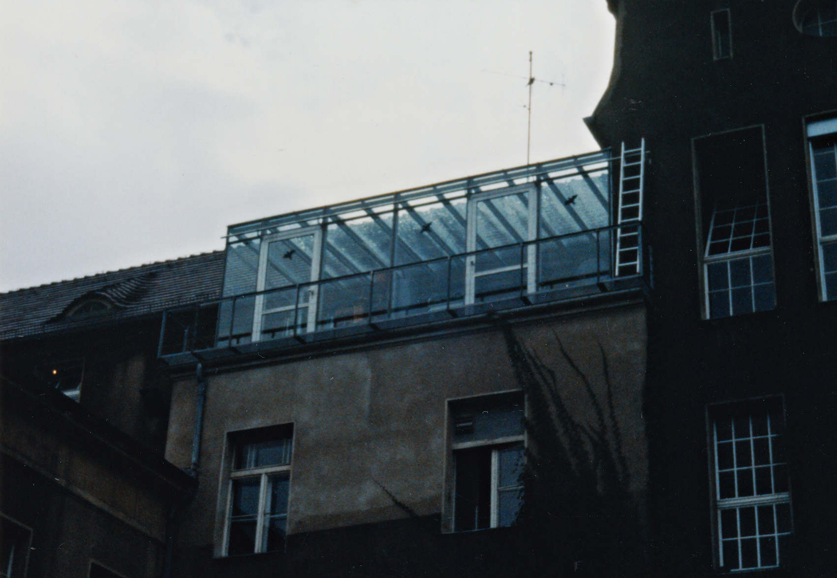 Aus verzinkten Stahlprofilen wurde eine innenliegende Tragstruktur gebaut, auf die von Außen, thermisch getrennt, Isolierglasscheiben befestigt wurden. Mit Dagmar Tauschev von der Senatsbauverwaltung beschloss man, für eine sichere Reinigung des Glases den Bau eines außenliegenden Umgangs. Die Lüftung erfolgte über die Zugangstür zum äußeren Umgang.