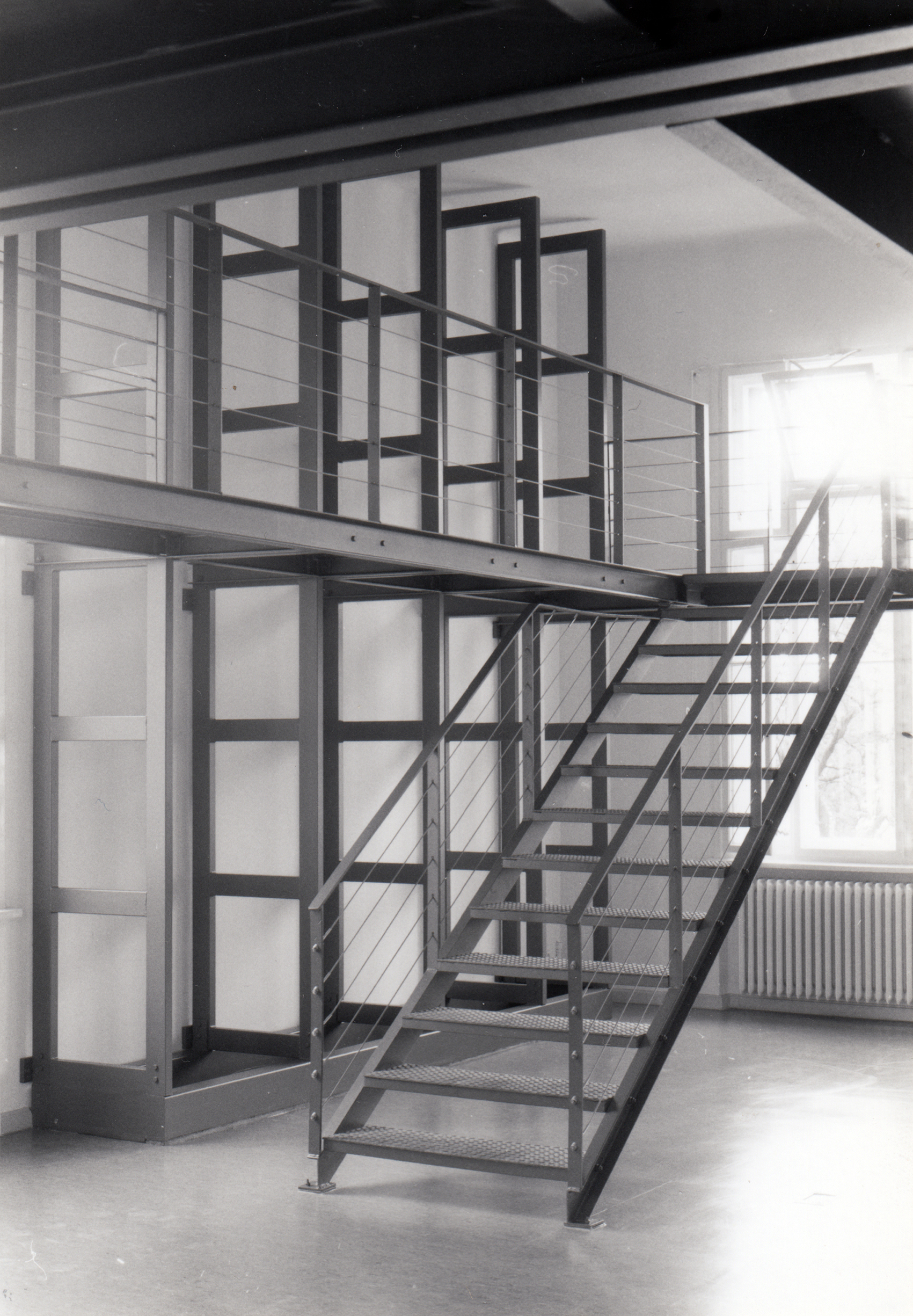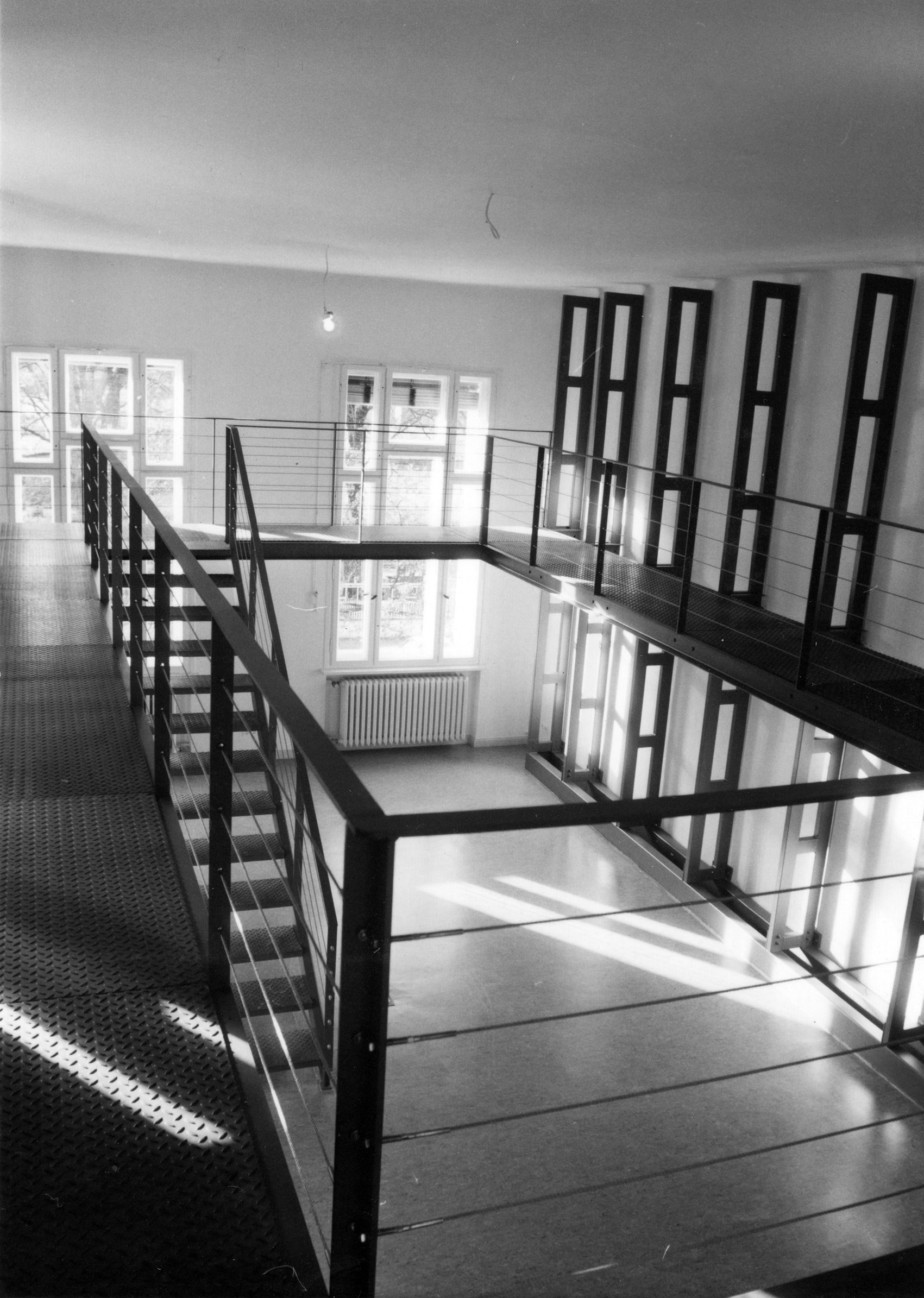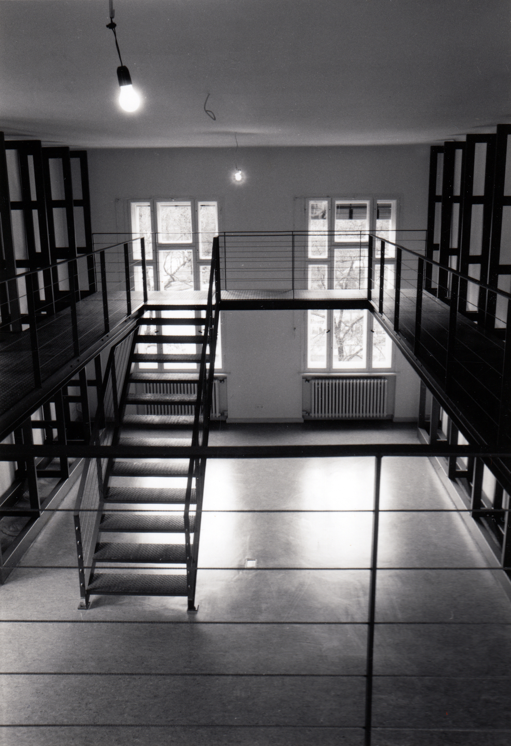 Aufgrund der hier vorgefundenen Bauhöhe wurden verglaste Regale auf drei Raumseiten auf zwei Etagen mit umlaufendem Arbeitsgang installiert. Zusätzlich gelang es im unteren Fensterbereich zwei Arbeitsplätze zu schaffen. Die leichte, wandgebundene Stahlkonstruktion liess es ohne bauliche Verstärkung zu, die Studiensammlung im ersten Stockwerk unterzubringen.