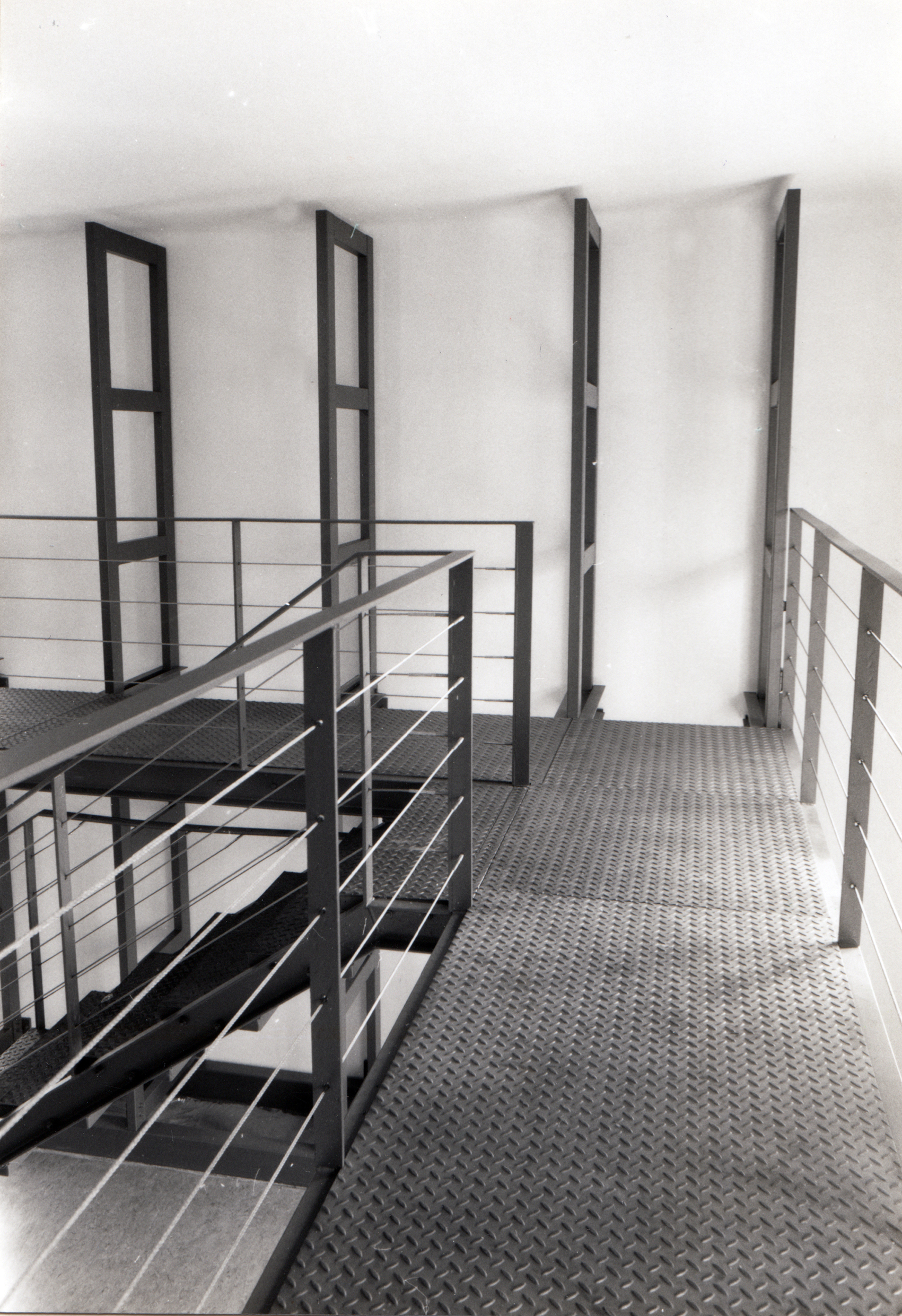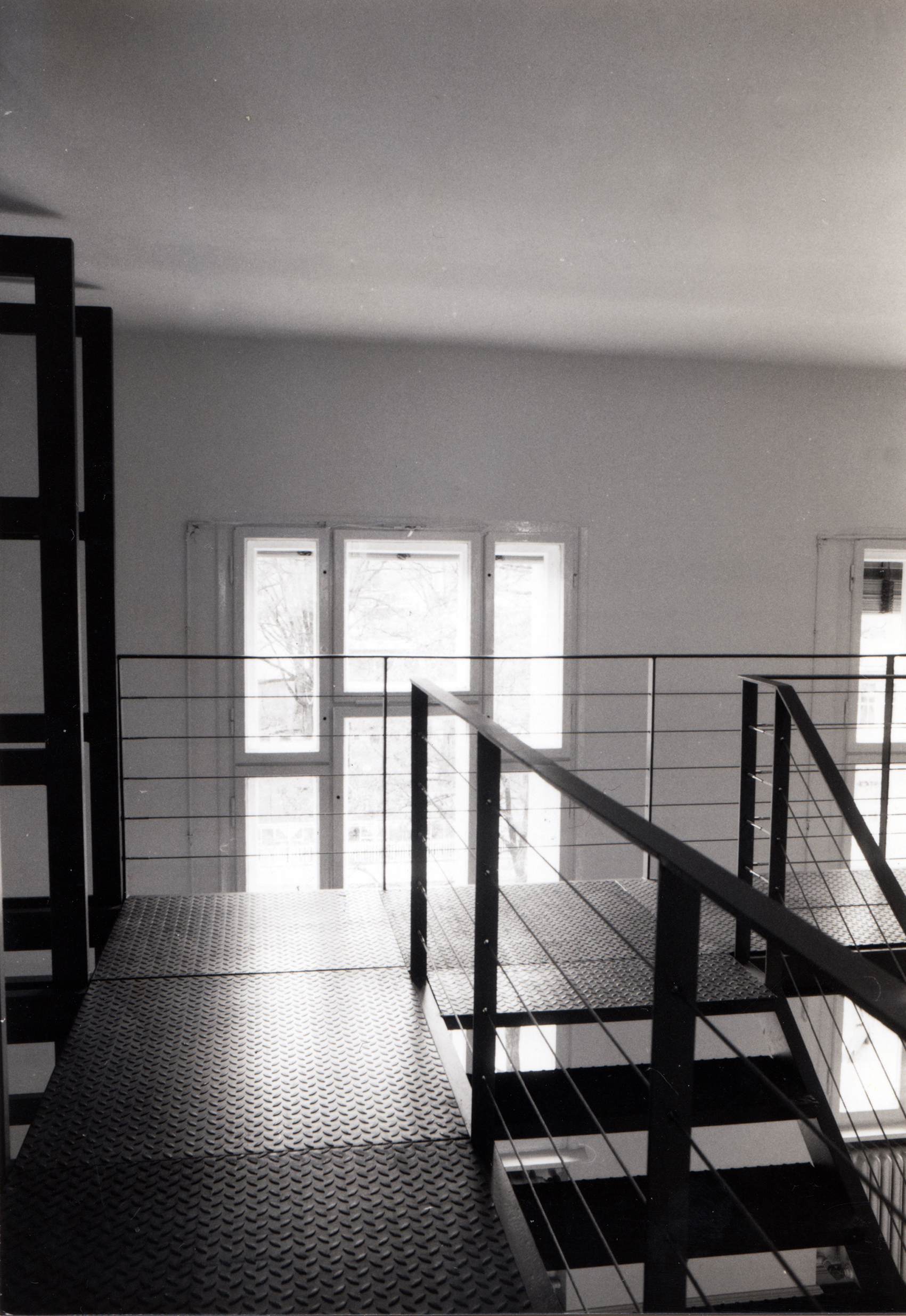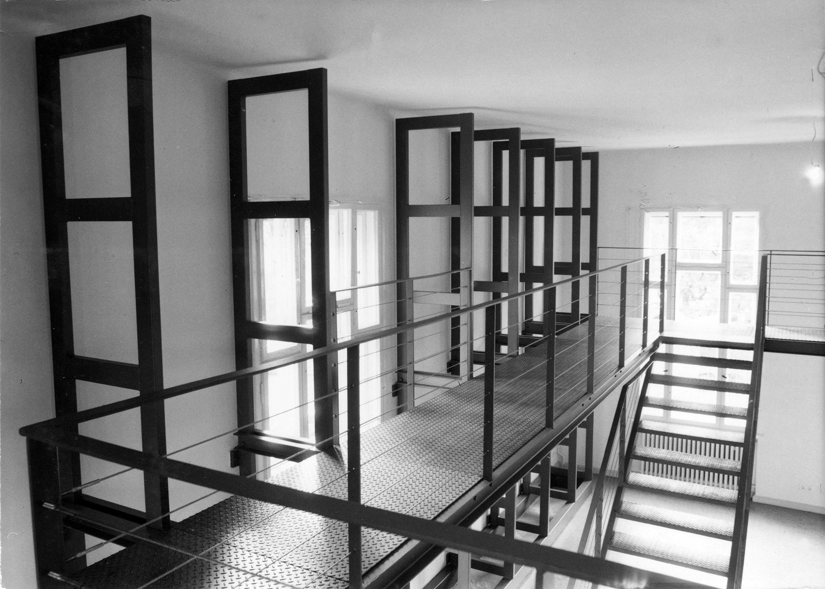 Aufgrund der hier vorgefundenen Bauhöhe wurden verglaste Regale auf drei Raumseiten auf zwei Etagen mit umlaufendem Arbeitsgang installiert. Zusätzlich gelang es im unteren Fensterbereich zwei Arbeitsplätze zu schaffen. Die leichte, wandgebundene Stahlkonstruktion liess es ohne bauliche Verstärkung zu, die Studiensammlung im ersten Stockwerk unterzubringen.